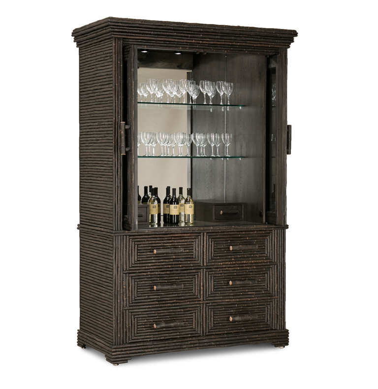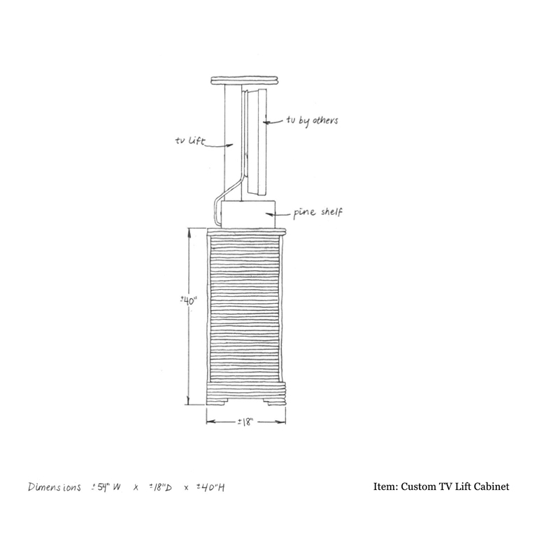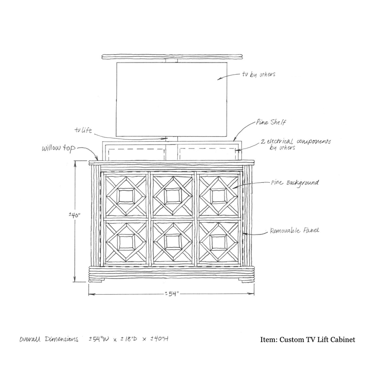 Custom TV Lift Cabinet with Black Pine Background & Willow Trim: