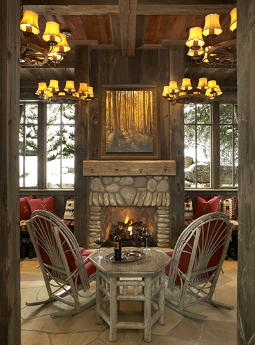 After an exhilarating day on the slopes, what could be better than sharing a bottle of wine in front of the fire in this charming room by Billy Beson, Minneapolis, MN? The La Lune rocking chairs and hexagonal side table are right at home in this rustic ski resort setting. (Rocking Chair #1072, Table #3440)